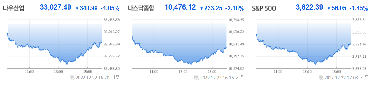 주요 이슈 - 22년 3분기 실질 GDP 잠정치보다 높게 발표, 긴축 우려 강화, 전 종목 약세 - FTX 샘 뱅크먼-프리드 미국으로 송환, 뉴욕 법정 출석, 2억 5천만 달러 보석 패키지로 풀려남 - 23년 회계연도 연방정부 예산안 상원 통과 1.7조 달러 규모 - 우크라이나 젤렌스키 대통령 미국 백악관 방문 - BOJ, 이르면 다음 달에도 통화정책 긴축 가능성 제시 시장금리 / 유가 - 국채 10년 물은 1.8bp 상승, 3.68% - 국채 2년 물은 5.8bp 상승, 4.27% - 달러 인덱스는 0.24% 상승, 104.41pt - 원/달러 환율: 1,291원 - WTI 1.02% 하락, 77.49달러 특징주 - 대형 기술주 - 애플 2.3%, 아마존 3.43%, 마이크로소프트 2.55%, 메타 2..